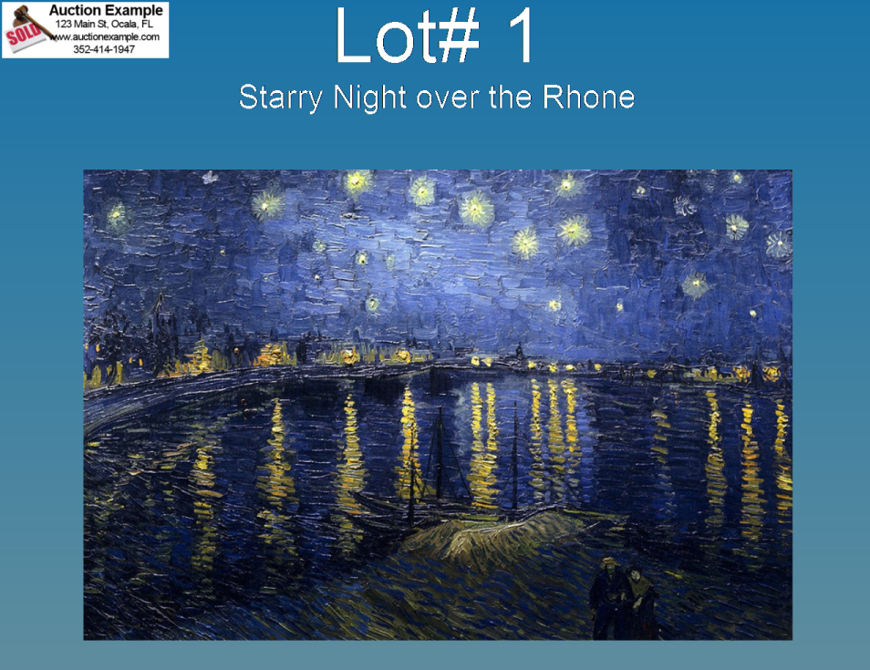 The Auction Presenter settings can be adjusted to show your logo, additional description information, custom colors for the background, hi-res images and specific placement for the above. For more information regarding the Auction Presenter feature and how it can improve the quality of your next auction, please Contact Us!